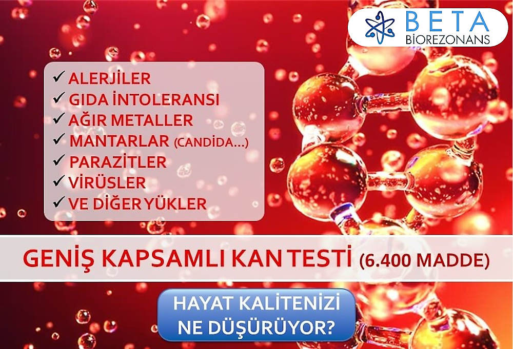 Beta Biorezonans Merkezinde yaptırabileceğiniz geniş panel kan testi, Alman teknolojisi cihazlarla biyofiziksel olarak yapılır ve parmaktan alınan kan örneği üzerinde 6.400 patolojik maddenin frekans taraması gerçekleştirilir.
