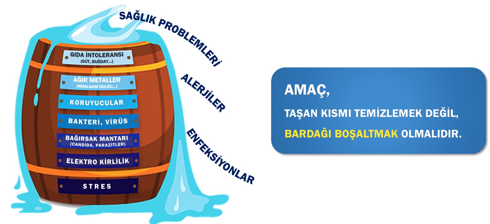 Bu bardak tamamen dolduğunda, ilk olarak açıklanamayan reaksiyonlar, alerjik reaksiyonlar ve kronik yorgunluk ortaya çıkıyor; bu yükleri taşımaya devam ettikçe ciddi fiziksel rahatsızlıklar da görülmeye başlanıyor.